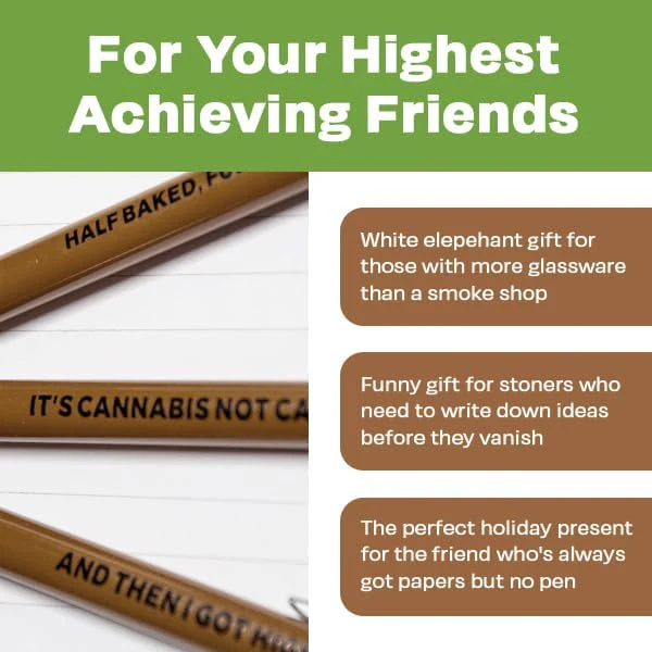 - Half Baked, Fully Functional – Pens with cannabis quips that hit harder than your last edible.