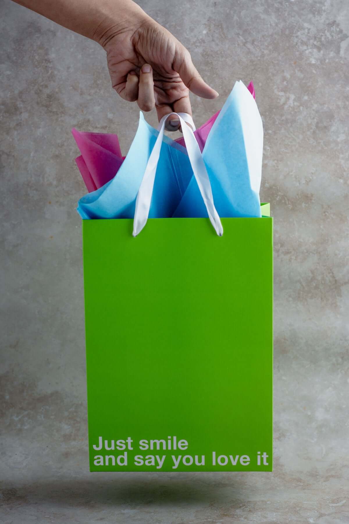 This funny gift bag says what everyone is already thinking: “Just smile and say you love it.” It’s dry, honest, and perfect for gifts that might be questionable but still given with good intentions. The joke lands before the gift is even opened, which is exactly the point.