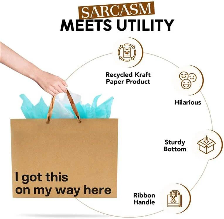 - πππππππππ ππππππ πππππππ: Make your friends and family laugh before they even see the present! Each gag gift bag in this 5-pack showcases a bold black printed phrase with sharp humor. Five unique sayings like βAct surprisedβ and βFinally, a bag as extra as you areβ add a personal, witty touch to any gift. The lettering is eye-catching and crisp, so the sarcastic message wonβt be missed, instantly lightening the mood at any gathering.
